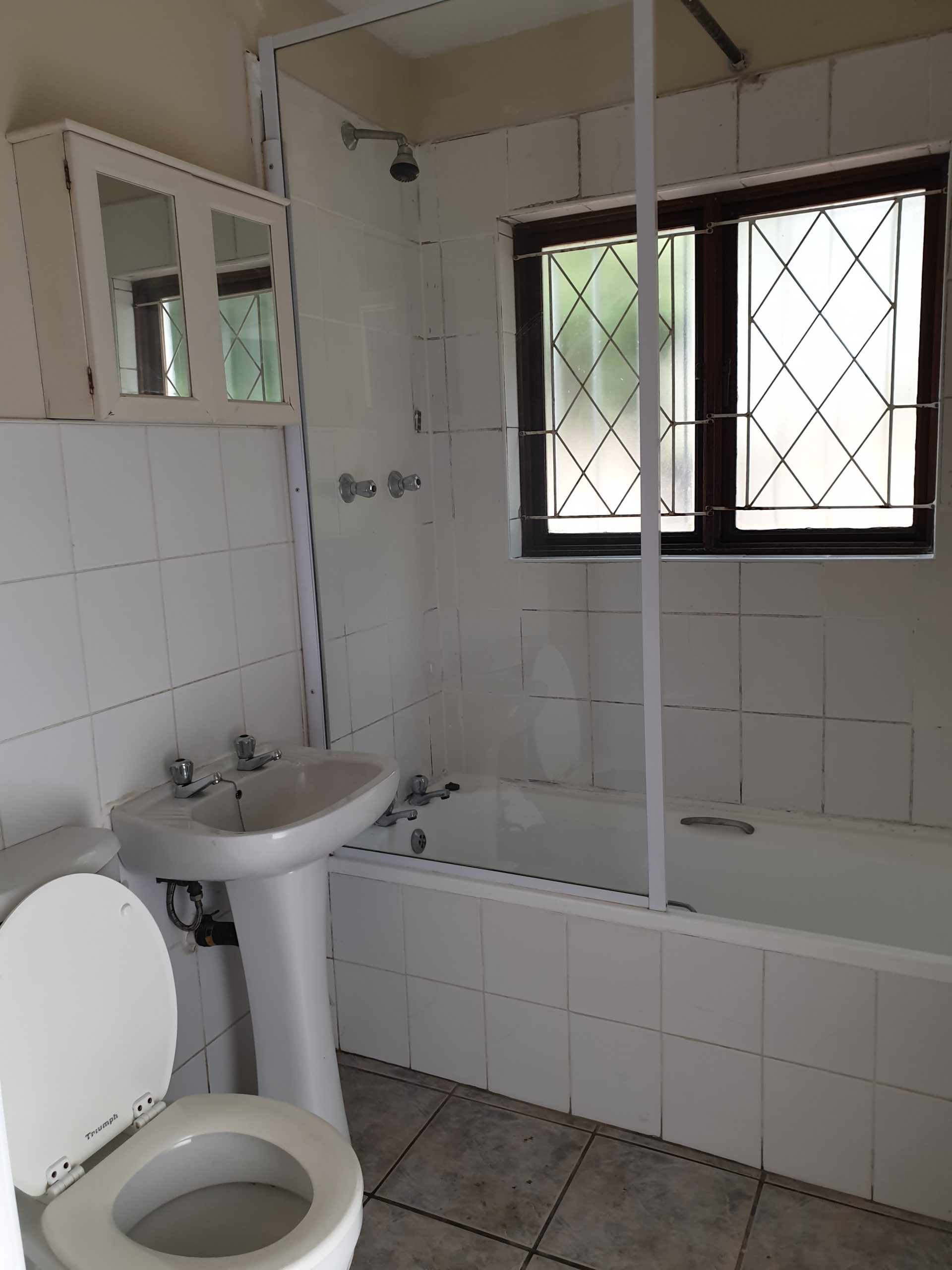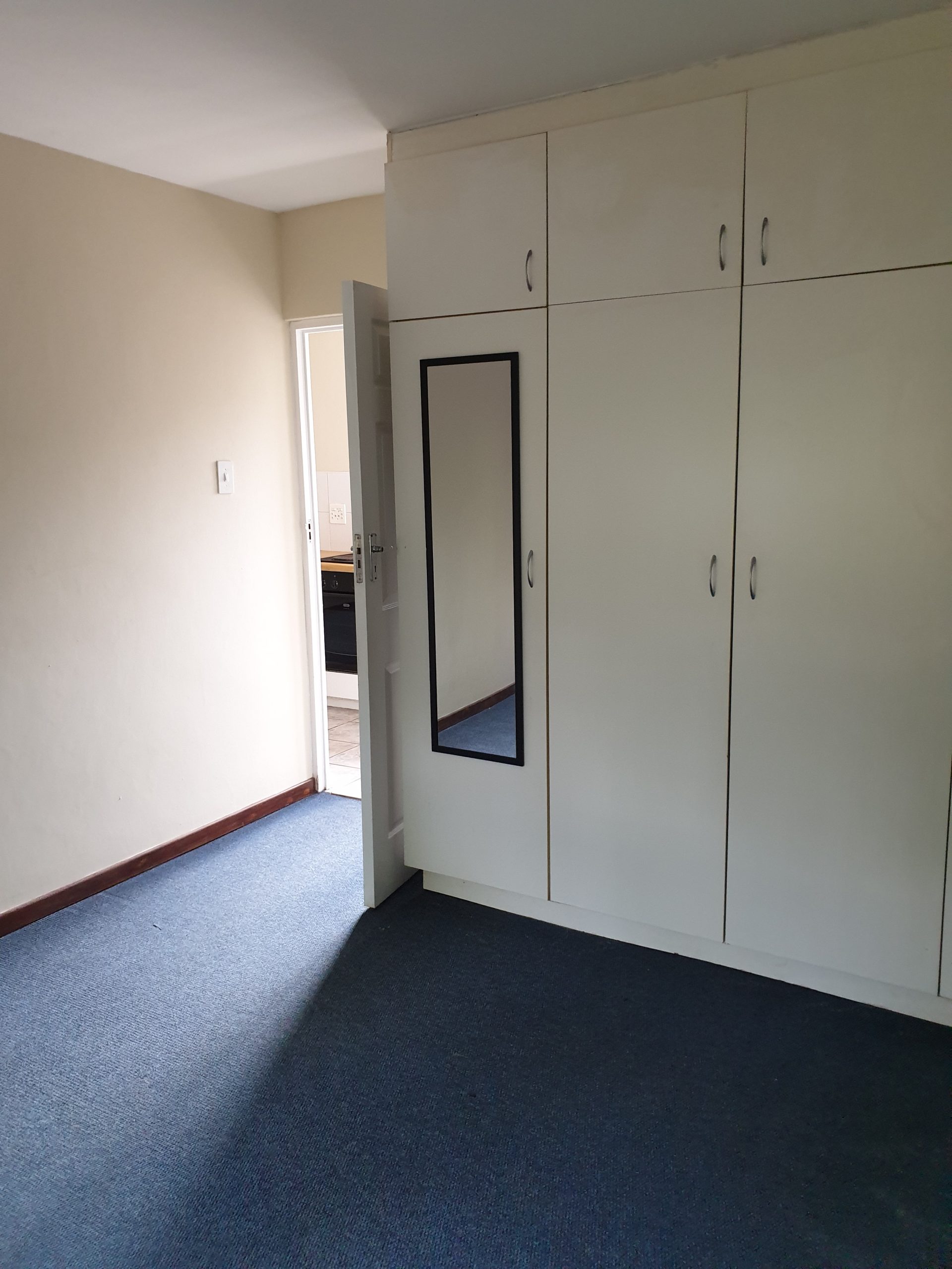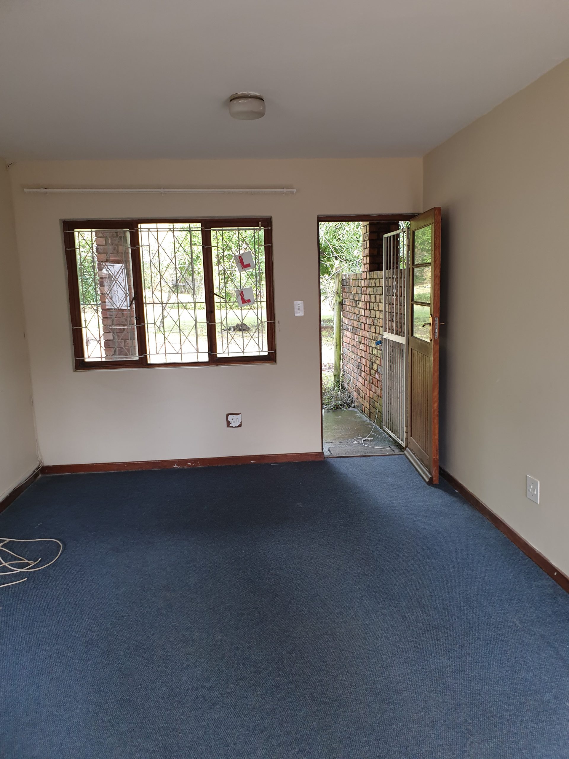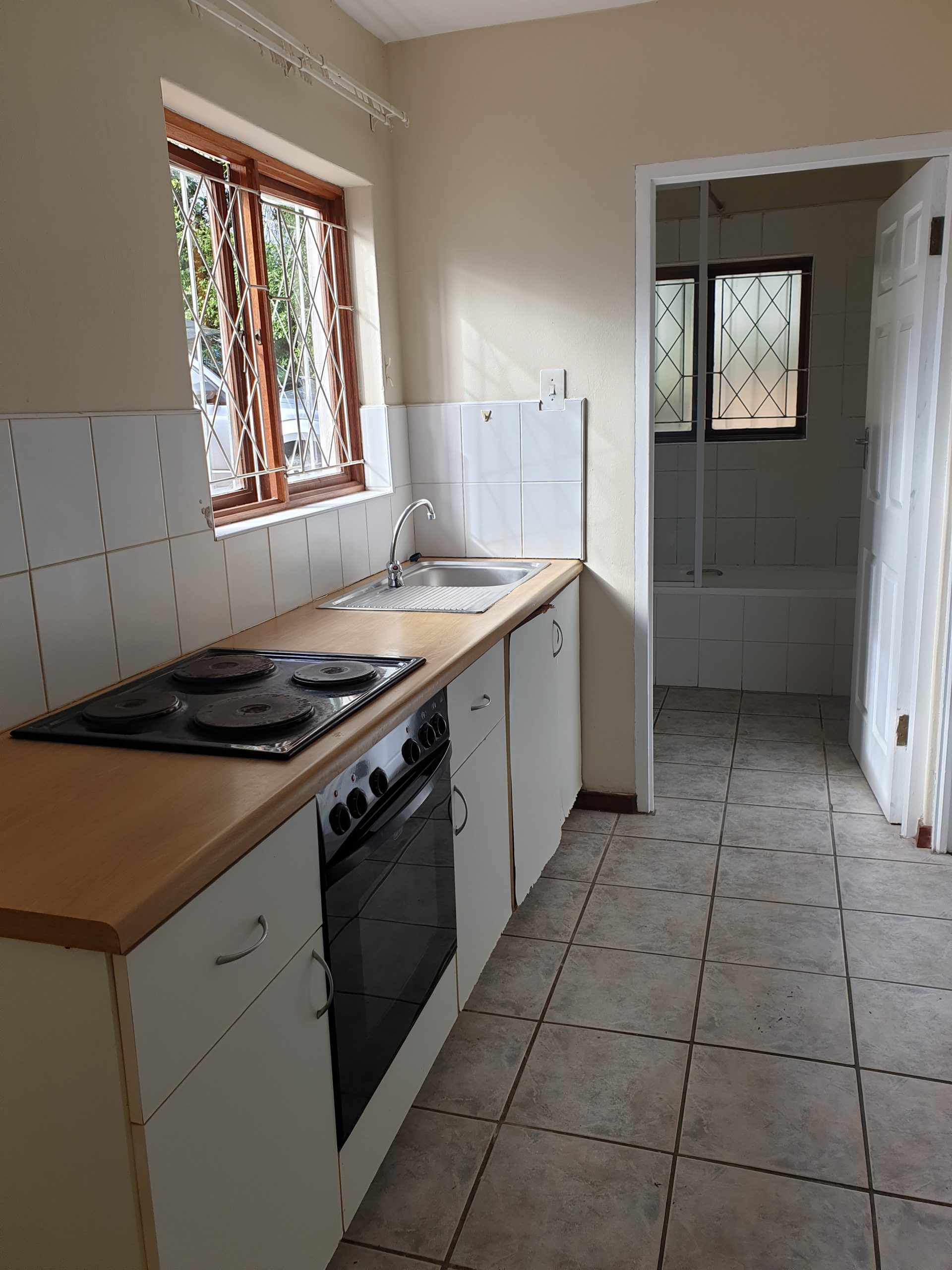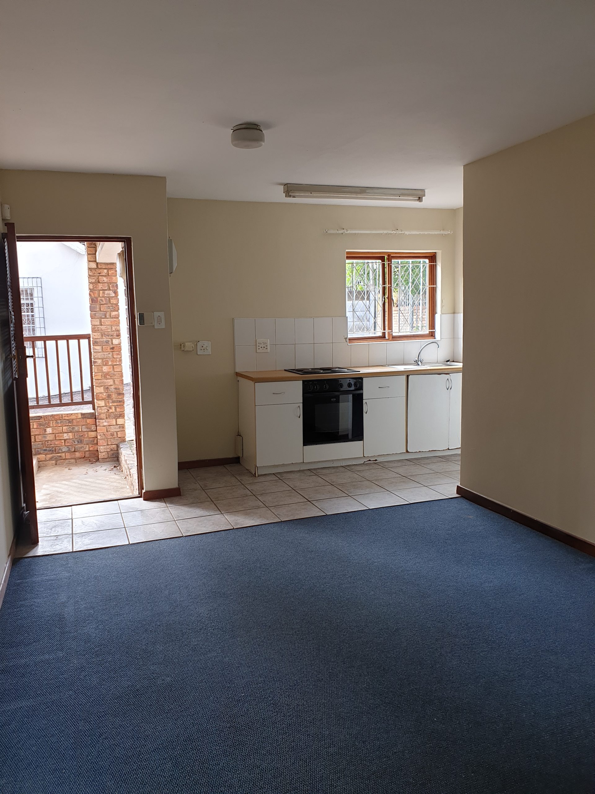 So, what do you get? You get an attractive face brick building and the ground floor unit on the left as you face the building. There’s a decent sized private bedroom, carpeted, with built-in cupboards, plus a bathroom with a shower over the bath, basin and loo. The living area is open plan with the kitchen, has a tiled floor and enough cupboard space. The living room opens out onto a covered patio, which has a small garden area off the patio. There is also parking on the south side of the building.